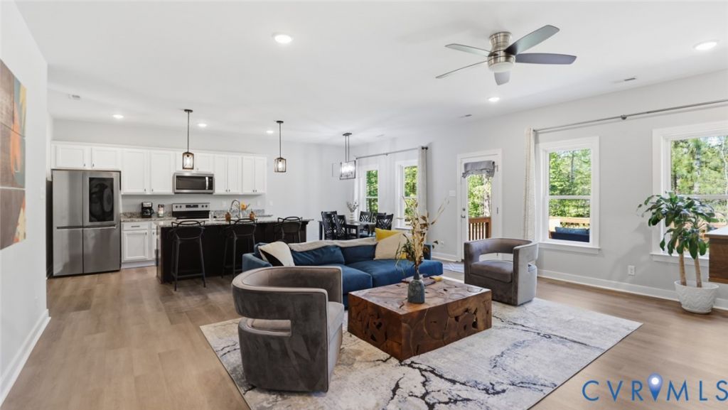 Welcome to 3436 Horseshoe Drive, built in 2021 in the Five Lakes community. This 3-bedroom, 2-bath home sits on a half-acre lot overlooking the 4th hole of Brookwoods Golf Course. Inside, enjoy a bright open-concept floor plan with neutral tones, luxury vinyl plank flooring, and 9-foot ceilings. The kitchen boasts granite countertops, white shaker cabinets, stainless steel appliances, and an island with bar seating. The large primary suite features a walk-in closet and double-vanity bath. Outside, a fenced backyard with a deck and a paved RV-ready driveway add convenience. With a bonus room upstairs, a two-car garage, and easy access to both Williamsburg and Richmond, this modern home offers it all!